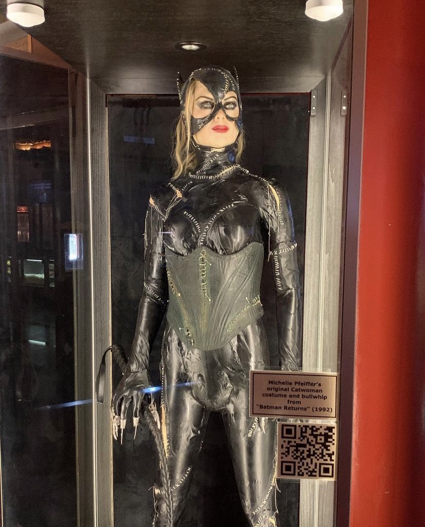 Michelle Pfeiffer as Catwoman in "Batman Returns" (1992, Tim Burton) Cat woman costume. Catwoman Costume for Adults You will look fierce in this Catwoman costume! This original Michelle Pfeiffer -inspired stitched costume offers a super sassy look for any superheroes and villains party or 90s-themed event This costume was worn by the character, "Catwoman" portrayed by Michelle Pfeiffer in the 1992 film, "Batman Returns", directed by Tim Burton